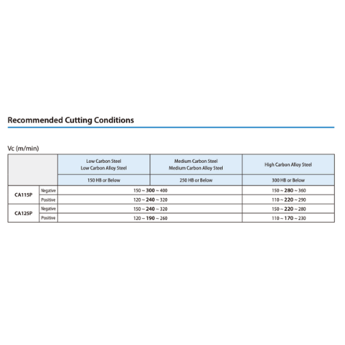 The CA125P MEGACOAT TOUGH grade utilizes a multi-layer CVD coating for improved adhesion and heat resistance, providing a balance of wear resistance and toughness for steel machining. This ensures stable cutting performance, excellent surface finish, and extended tool life in both high-speed and lightly interrupted operations.