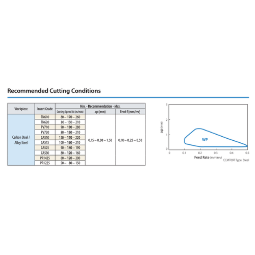 • Depth of Cut (ap): 0.1 – 2.0 mm